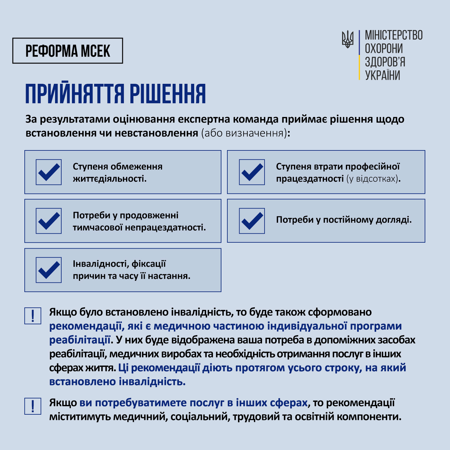 ВАЖЛИВО: Усі документи (довідки, акти, висновки, індивідуальні програми реабілітації), які були видані МСЕК до 31 грудня 2024 року, залишаються чинними та є підставами для отримання визначених законодавством гарантій, пільг, виплат, допомоги, відстрочок тощо.
